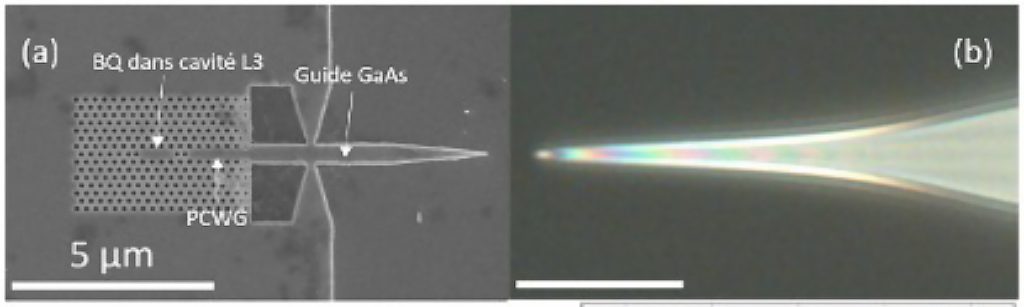 Semiconductor-based quantum dots have demonstrated remarkable potential for quantum information applications, such as the bright emission of single and indistinguishable photons or the creation of qubits that can be initialized, manipulated, and read using light pulses. Many challenges remain to be overcome in order to make their use robust and to create platforms where multiple qubits can be addressed and entangled with each other. To this end, several approaches have been proposed in the literature, including introducing emitters into photonic cavities to increase light-matter interaction and coupling the nanostructures to photonic waveguides for efficient photon extraction. Researchers at INSP, in collaboration with colleagues from C2N, have shown that photons emitted by quantum dots (QDs) inserted into photonic crystal cavities and coupled to waveguides can be collected in the plane by a conical optical fiber, thanks to evanescent mode coupling between the guide and the fiber.