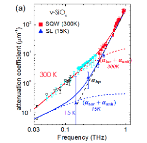 The quantitative results experimentally confirm the theoretically predicted quartic attenuation law with a prefactor that exhibits remarkable independence from temperature in the range 15-300 K, characteristic of an athermal process. This experimental value is satisfactory agreement with the prediction of the SPM model. Analysis of the acoustic field phase reveals significant negative dispersion, characterized by a decrease in phase velocity above 0.5 THz, in agreement with theoretical predictions.
