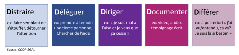 Dans la continuité de la précédente brève sur les Violences Sexistes et Sexuelles, comment réagir lorsqu’on est témoin d’agissements sexistes ? La méthode des 5 D (Distraire, Déléguer, Diriger, Documenter, Différer) permet de mettre fin à la situation d’agression et de se montrer solidaire envers la victime.